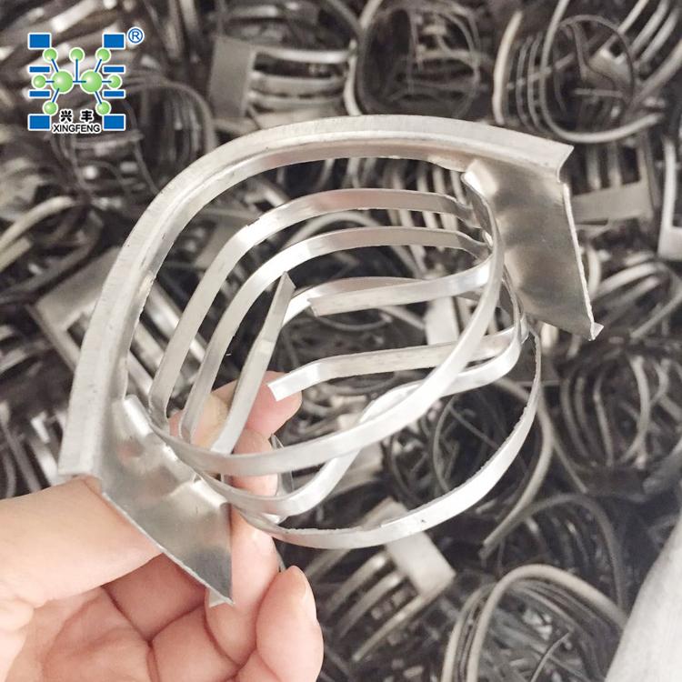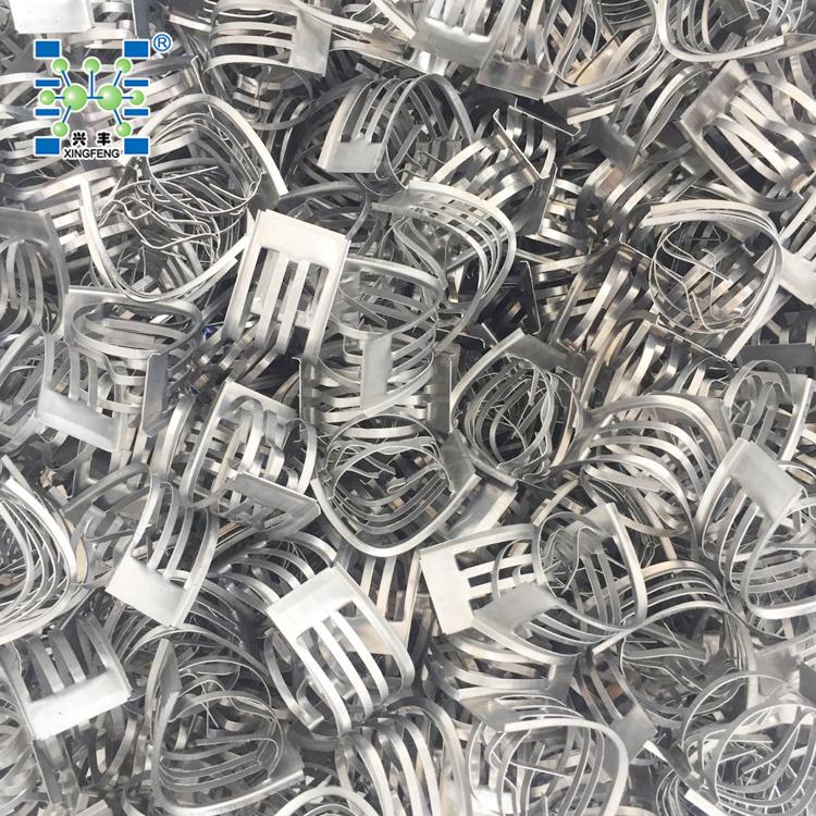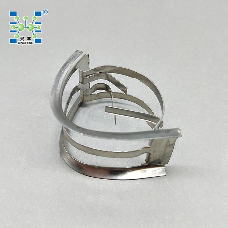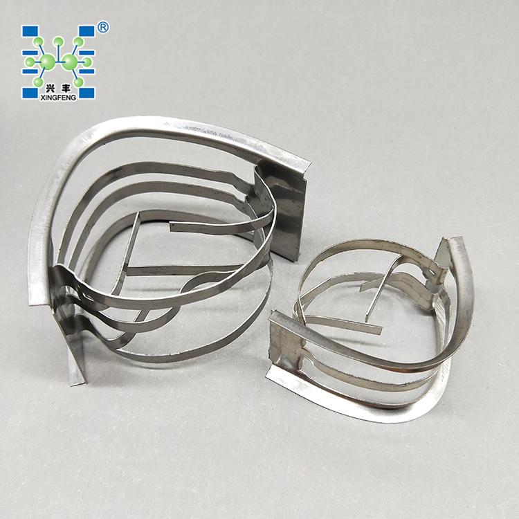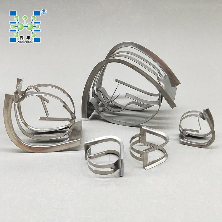 金属环矩鞍填料是美国Norton公司开发的,它的形状介于环形与鞍形之间,因而兼有两者之优点。结构上金属矩鞍环填料在鞍形基础上增加了环形筋,避免了重迭,保证了一定的强度与刚性,冲出了几个小爪,增加了气液搅动,强化了传质,从而产生了独特的性能。