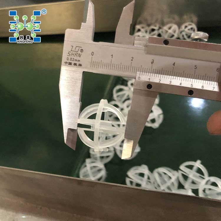 环保球(TRI)填料的特点是在填料有本体没有任何一块大的表面,而是由许多格栅状的枝条棒联接组合成为一个空心球体,此种填料不但空隙率高而且各个方面的自由截面积很大,向异性很小。