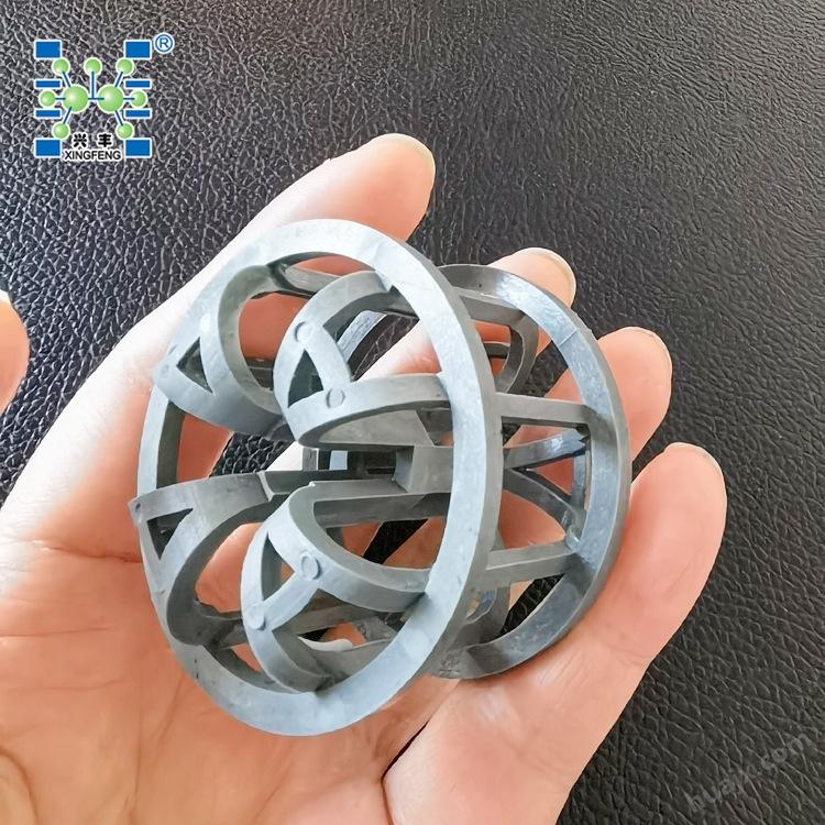 我司生产的CPVC灯笼环填料是由形如椭球的填料由两层圆环呈丝状绕结而成,并在中间部增设一条加强筋,这样大大了灯笼环的抗压强度。同时该填料除具有一般的能量大,压降低等优点外,还由于填料空隙处能有较高的持液量,可使塔内液体的停留时间较长,从而增加了气液两相的接触时间,提高了填料的传质效率。CPVC材质灯笼填料除具有优异的耐氯碱外,还具有优良的耐氯气性能,其机械强度好,受高温(100℃)高压不变形。产品在烧碱和氯碱行业填料塔中广泛使用,解决了陶瓷和常规塑料填料被氯碱、氯气和次氯酸钠、氢氧化钠腐蚀或氧化的问题。
