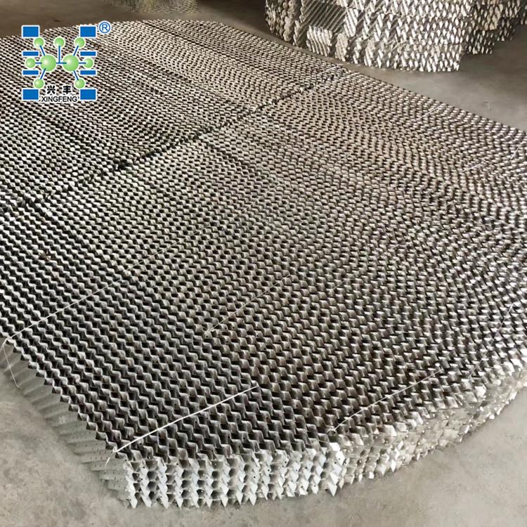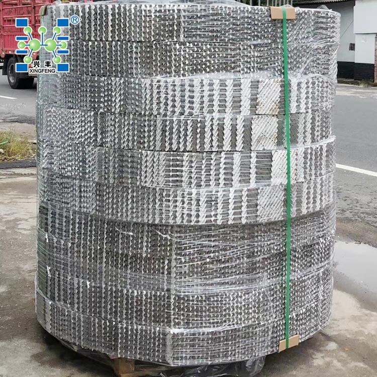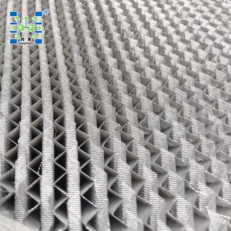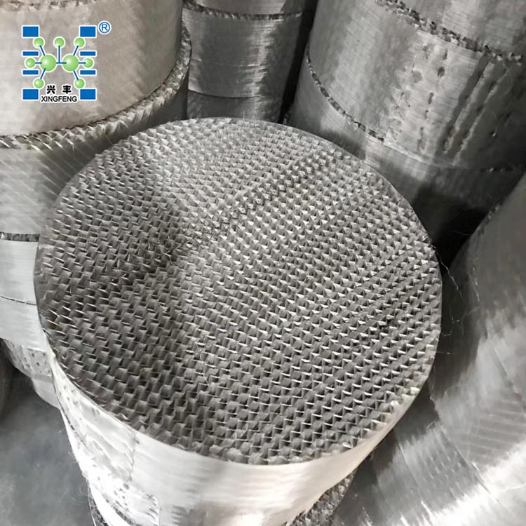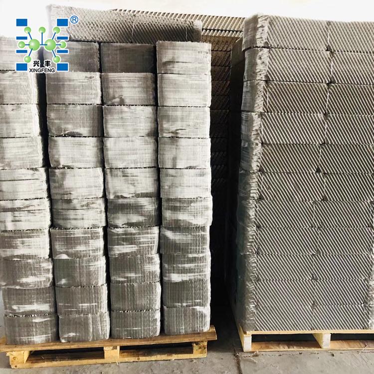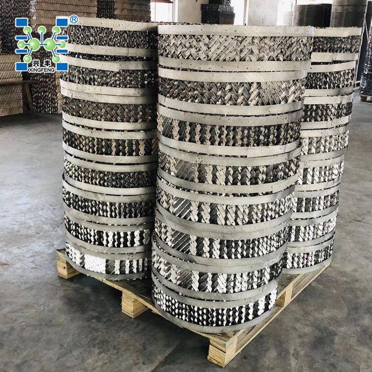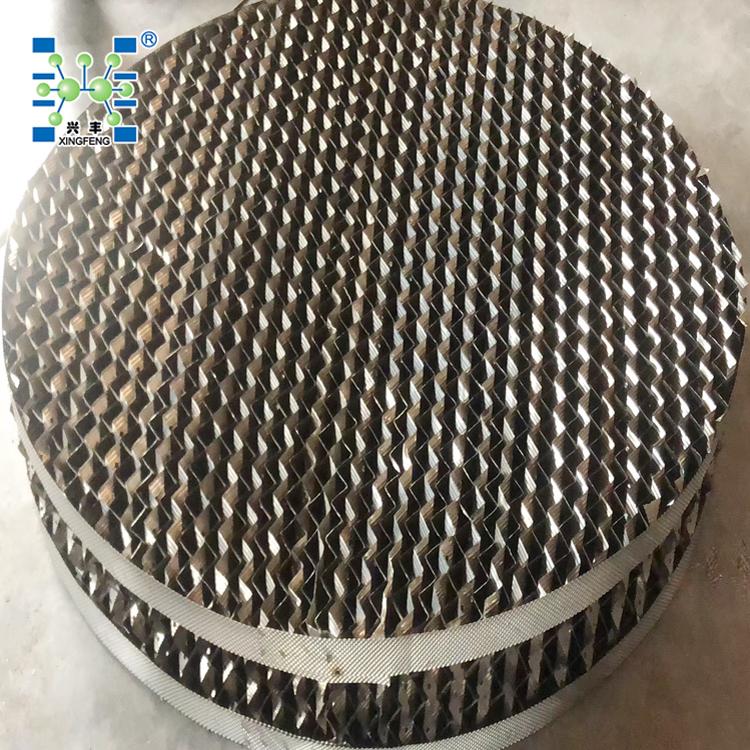 该填料保持了金属丝网波纹填料结构特点,改用表面有沟纹的孔板制成,增加了液体的均布和填料润湿性能,提高了传质效率。每盘单元高度为50-200mm,直径超过1.5m,填料制成分块形式。