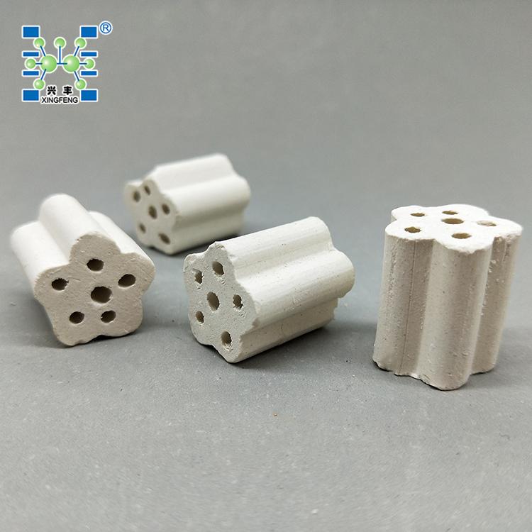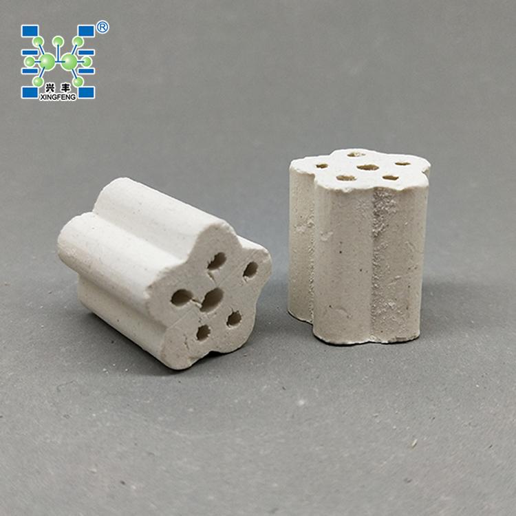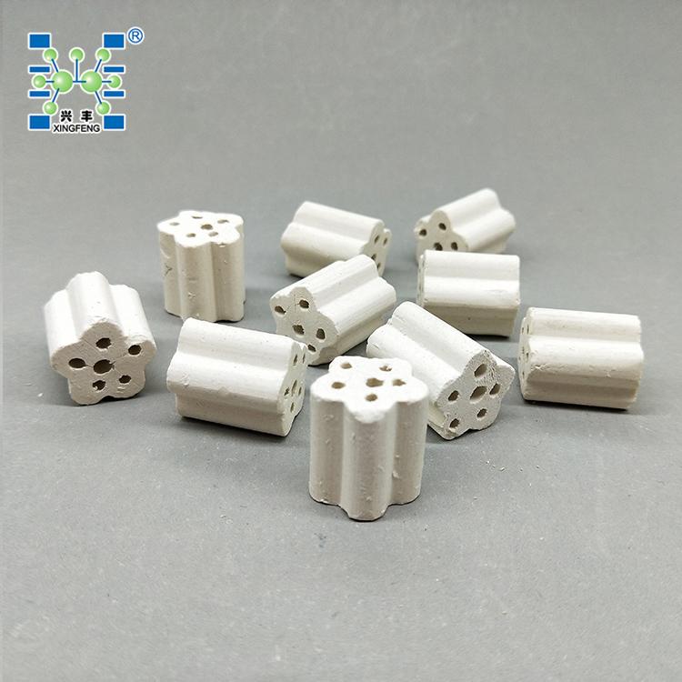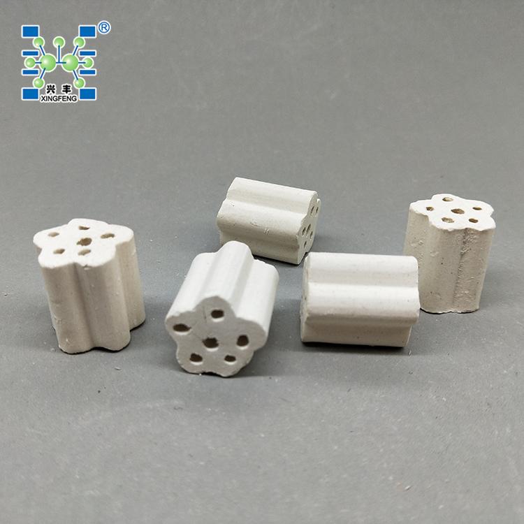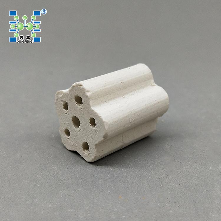 PM多孔支撑剂根据其外观形状又称齿轮形保护剂或称AIG齿轮形保护剂,是一种新型的石油化工加氢、制氢、重整等装置中的催化剂支撑剂、保护剂。该产品是我公司在综合国外技术的基础上采用了特别的结构设计,将支撑剂做成多孔梅花柱状(齿轮状),使之被侧放受力时,底部或顶部有两条以上承载线,增加了载荷能力,提高了侧压强度;花瓣的尺寸设计及轴向开孔,可以提高支撑介质的空隙率,从而降低了催化剂床层的压降。将该支撑剂与同类产品进行对比实验,结果表明,PM支撑剂与传统支撑剂相比,强度提高30% ,空隙率提高45% 以上。解决了一般的催化剂惰性支撑剂等支撑材料所遇到的一些缺陷,如常用的支撑剂有球形、柱形、环形等,但球形及柱形载体强度高但空隙率低,床层阻力大;环形载体空隙率高但强度低,容易破损,影响催化剂和装置的使用效率。同时该产品耐高温,陶瓷质耐温达1280℃,刚玉质耐高温达1650℃.